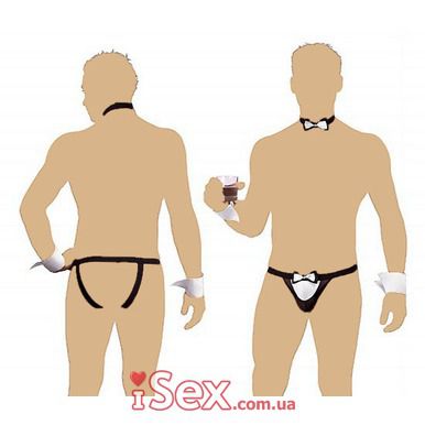 Описание товара Комплект мужской официантМужской комплект Официанта: стринги, манжеты и бабочка. Размер 46-48. Состав 100% полиэстер.