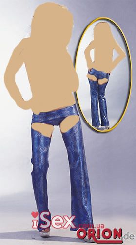 Описание товара Шорты-брюки блестящиеГолубые блестящие шорты-брюки с очень низкой посадкой красиво оголяют бедра и подчеркивают ягодицы.