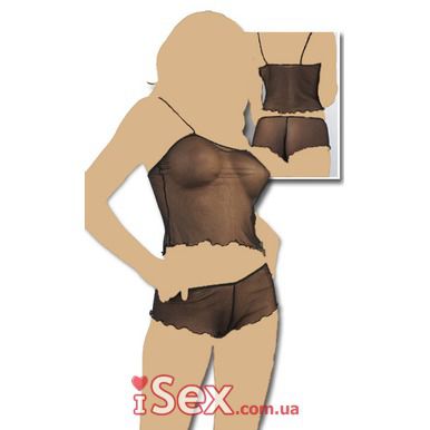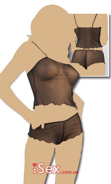 Описание товара Топ і шортики напівпрозоріНапівпрозорий комплект нижньої білизни чорного кольору - топік на тонких бретельках і шортики. 100% поліестер. Розміри: S, M, L, XL.